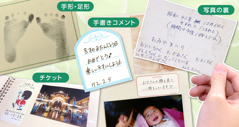 こうした小さな記録も写真と一緒に掲載し、相乗効果でその時代の空気や家族の感情がより鮮やかによみがえる仕上がりを目指しています。