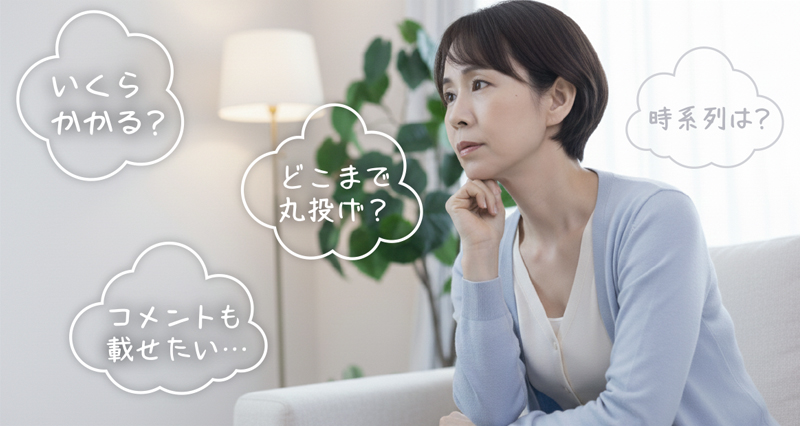 「アルバムが多すぎて整理する気力がない」、「料金の目安を知ってから相談したい」、「母の手書きコメントをちゃんと残したい」そんなお気持ちに、ひとつずつお答えしていきます。