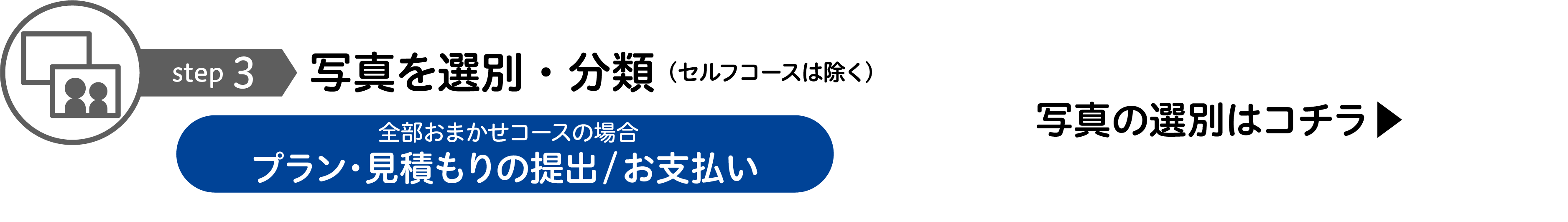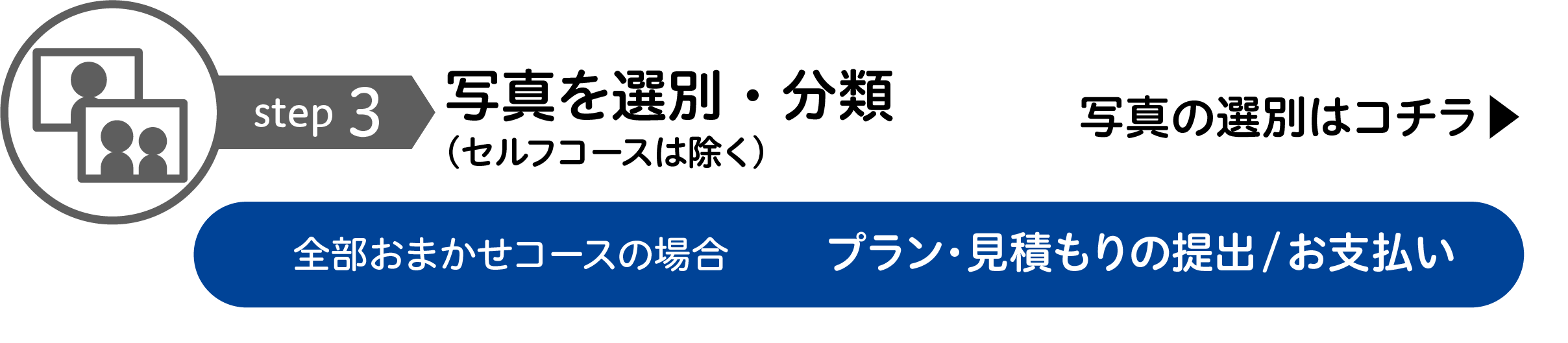 写真選別なしで、すべての写真をフォトブックに掲載することもできます。300枚以内の方は「セルフコース」から該当する商品をご注文ください。アルバムやバラ写真が大量にある場合は「全部おまかせコース」になりますので、お問い合わせください。